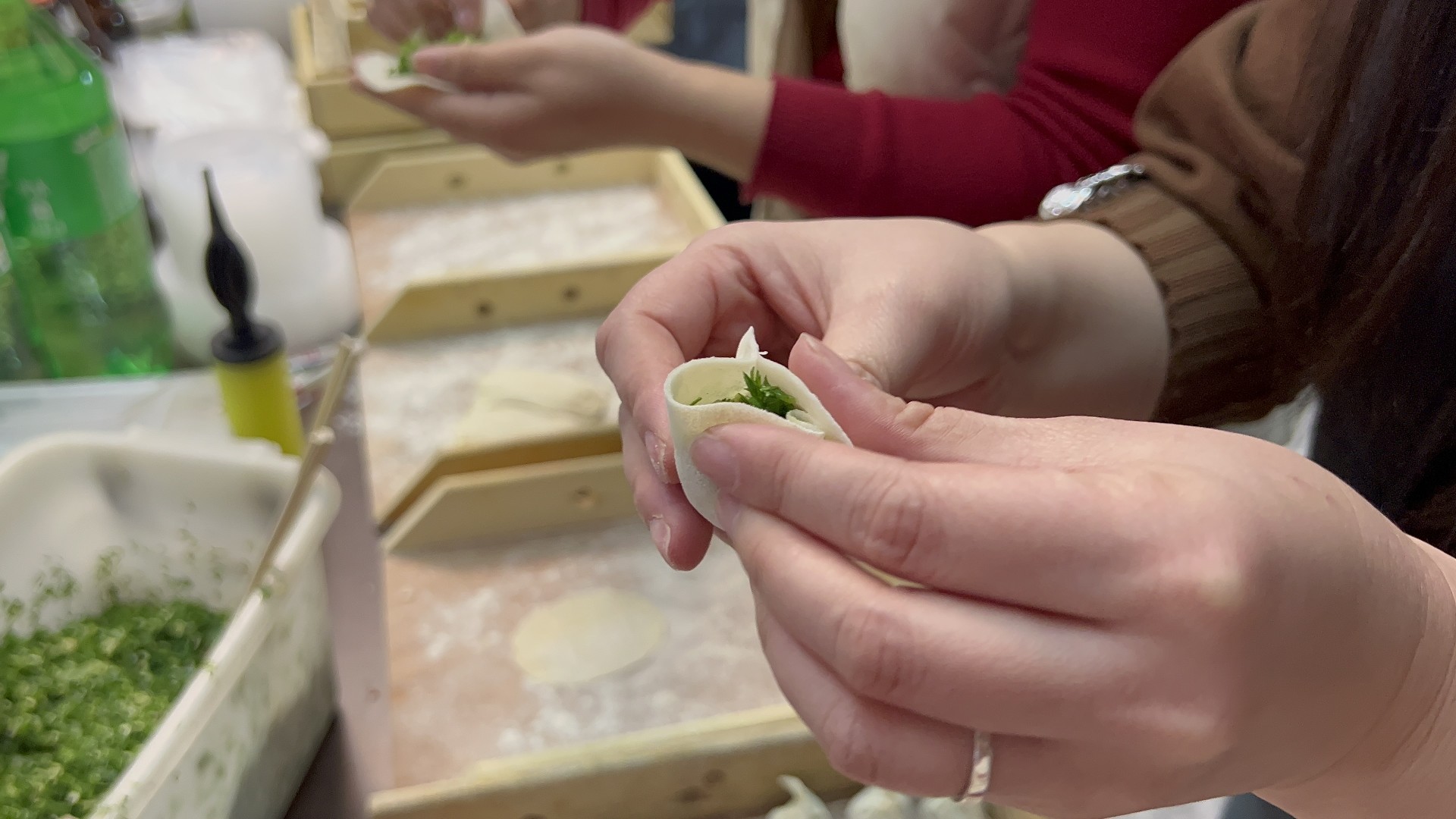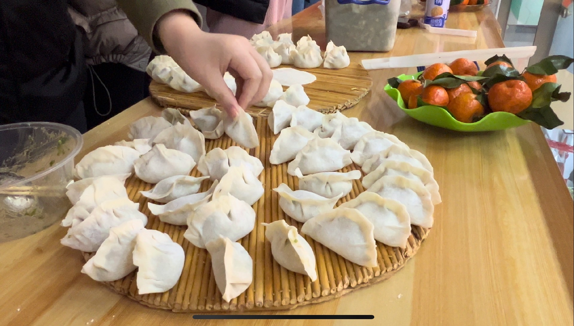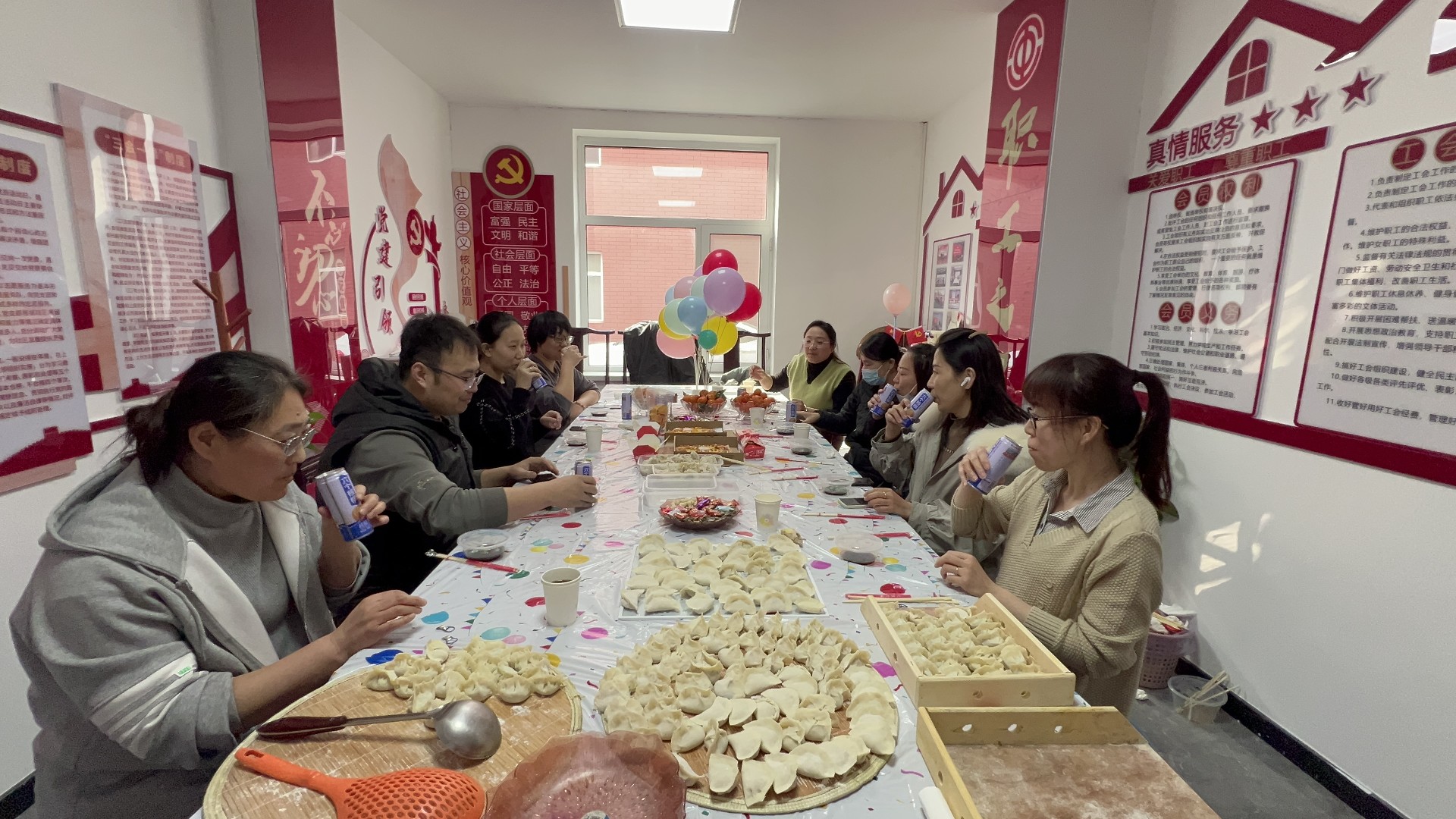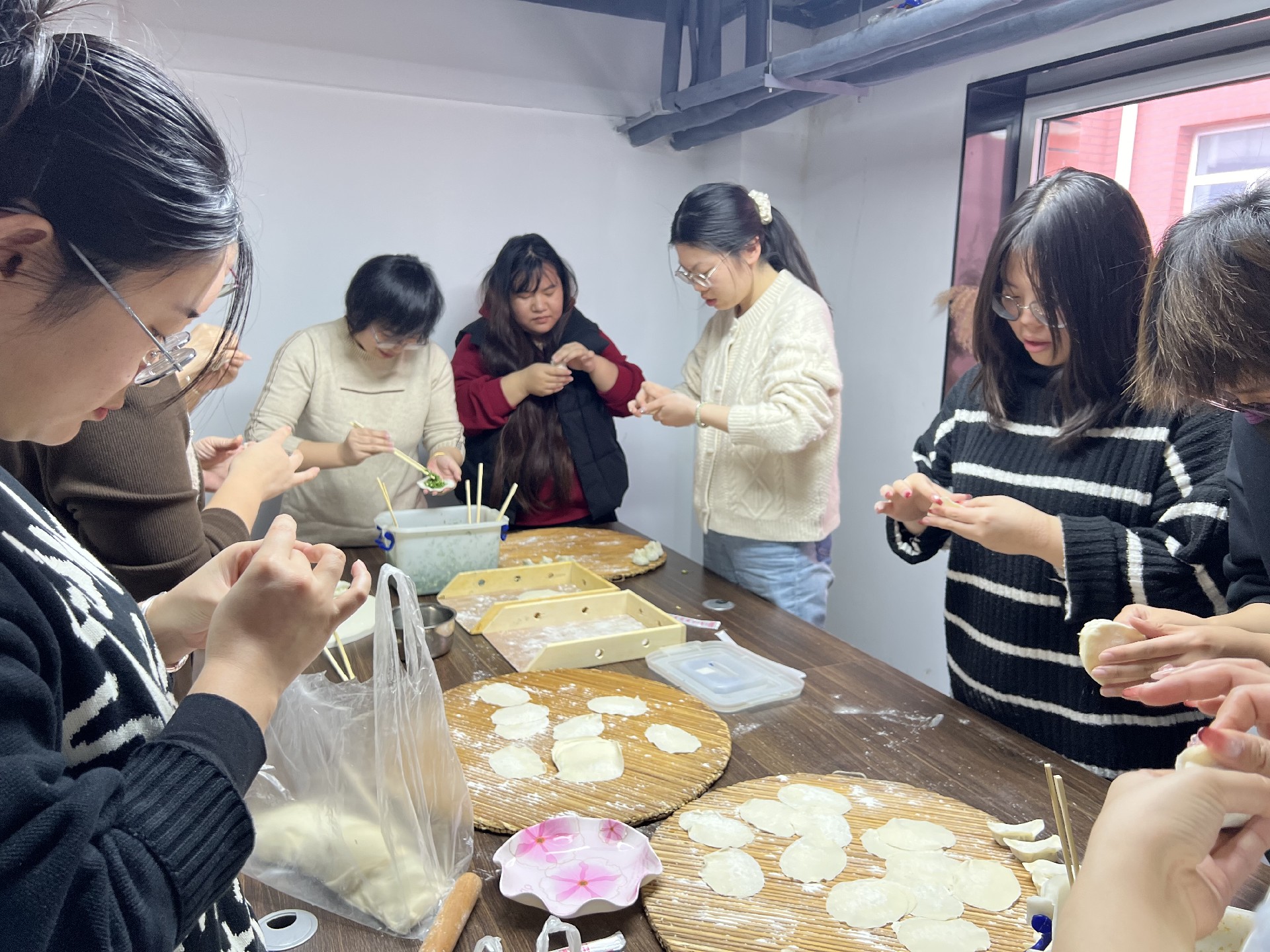 室外寒風(fēng)雖起,室內(nèi)其樂融融。大家分組行動(dòng),調(diào)餡、和面、搟皮兒、包餃子、擺餃子、燒水、煮餃子、裝盒......大家圍坐一起,品嘗勞動(dòng)果實(shí)。熱熱乎乎的餃子,溫暖了金卷人的心。